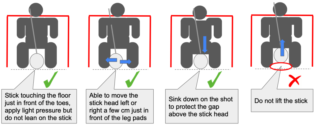 When you are in the correct stance, there will be gaps around your stick head and your leg pads. This area is known as the “5-hole” as per the number 5 on a dice.