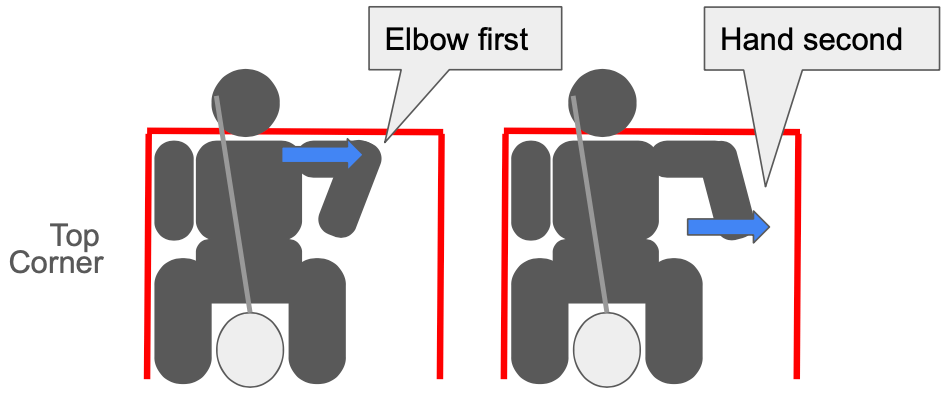 For a top corner shot, your elbow moves first, followed by your hand. The goalie glove has significant padding on the non-palm side. Don’t even think about catching the ball. Just block it.