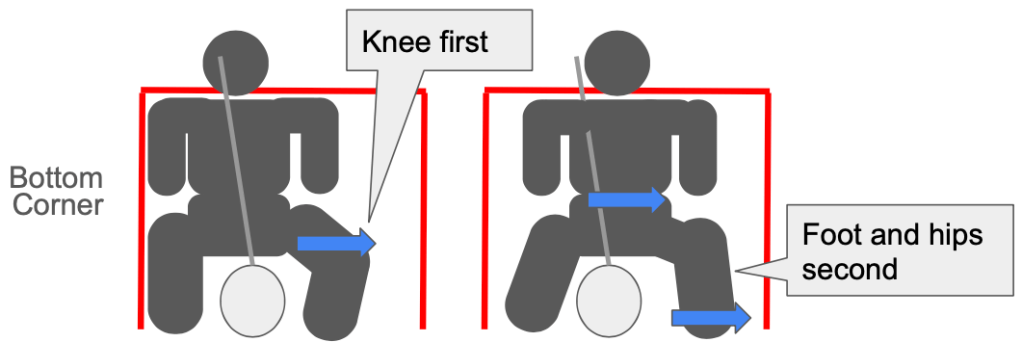 For a bottom corner shot, your knee moves first, followed by your feet. This is a much harder move to perfect as can feel unnatural. The knee moves first as this forces your hips and body to move across.