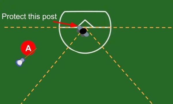 The attacking ball carrier may either take the ball behind the goal, or receive a pass from behind the goal. In many cases, they are looking to score from a dunk shot.
